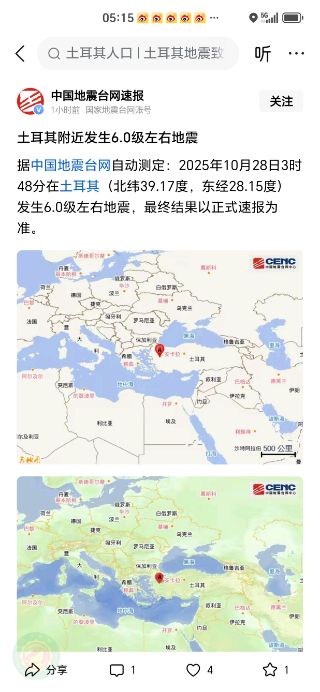 据中国地震台网自动测定:2025年10月28日3时48分在土耳其(北纬39.17度,东经28.15度)发生6.0级左右地震,最终结果以正式速报为准。