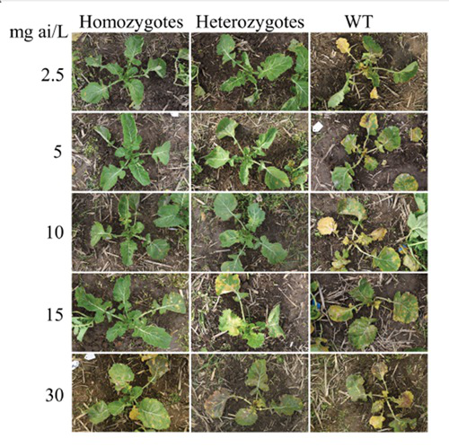 研究人员在成功对BnALS1基因Pro197进行靶向突变,共获得两种类型的突变体,碱基编辑效率为1.8%。上述突变体可稳定遗传,并在T1代即可获得剔除T-DNA的纯合突变材料。分别对野生型(转基因受体材料)、纯合突变体和杂合突变体喷施不同浓度的苯磺隆,发现野生型植株在较低浓度下就受到严重药害,而 P197S纯合突变体和杂合突变体在3倍于田间推荐喷施剂量的浓度下均未表现任何药害症状,且纯合突变体在更高剂量下仍然能存活。