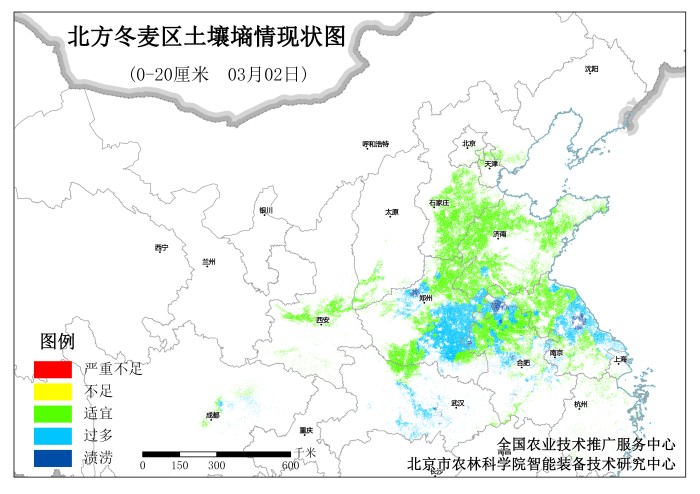 2月28日至3月2日我国中东部地区出现大范围雨雪,3月2日全国土壤墒情监测系统数据显示,北方冬麦区土壤墒情整体适宜。0—
