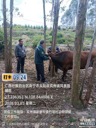 2026年3月4日,宾阳县动物疫病预防控制中心驻宾州片区工作站张世城到宾州镇陆村村委潘村开展春季动物防疫工作的指导。