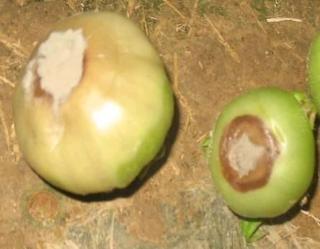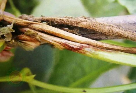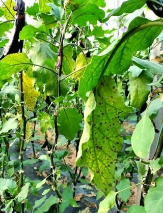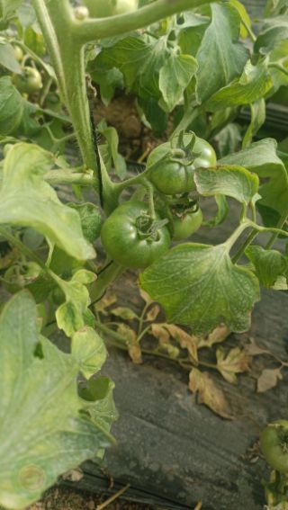 黄萎病症状,是危害棚室较严重的病害,病菌在土壤里从根部伤口侵入,植株半边叶片中午天热时萎蔫,逐渐变黄。